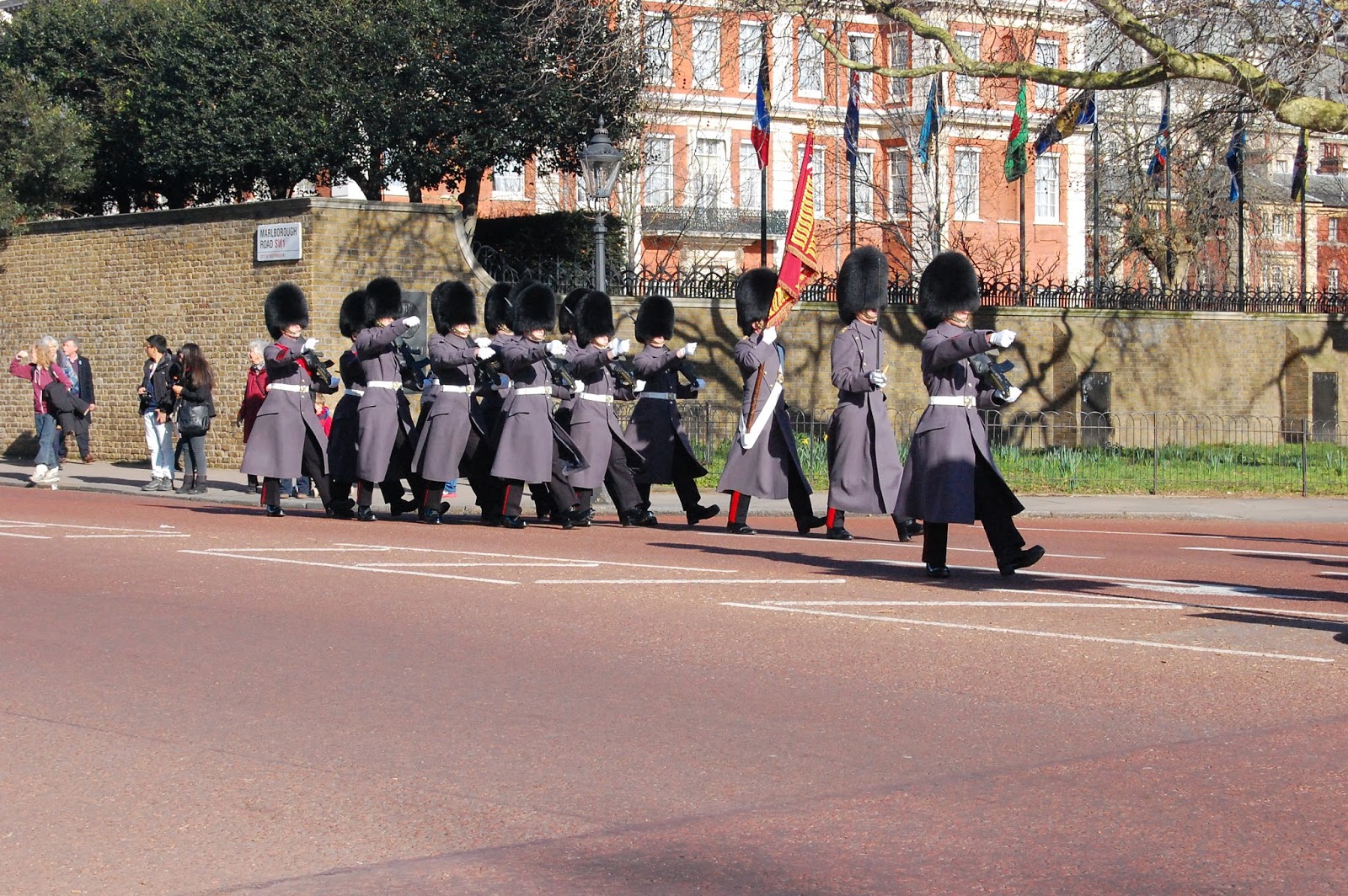 Zmiana warty to podobno niezłe show, które warto zobaczyć. Zgodnie z planem udało się nam przybyć w okolice Pałacu Buckingham przed 11:00, jednak ilość ludzi dookoła sprawiła, że nie miałam ochoty stać całą godzinę i wgapiać się w czyjeś plecy. Poszliśmy więc dalej, przecież jestem zbyt niecierpliwa by czekać. Był to bardzo dobry wybór, bo na strażników natknęliśmy się gdzieś po drodze 🙂